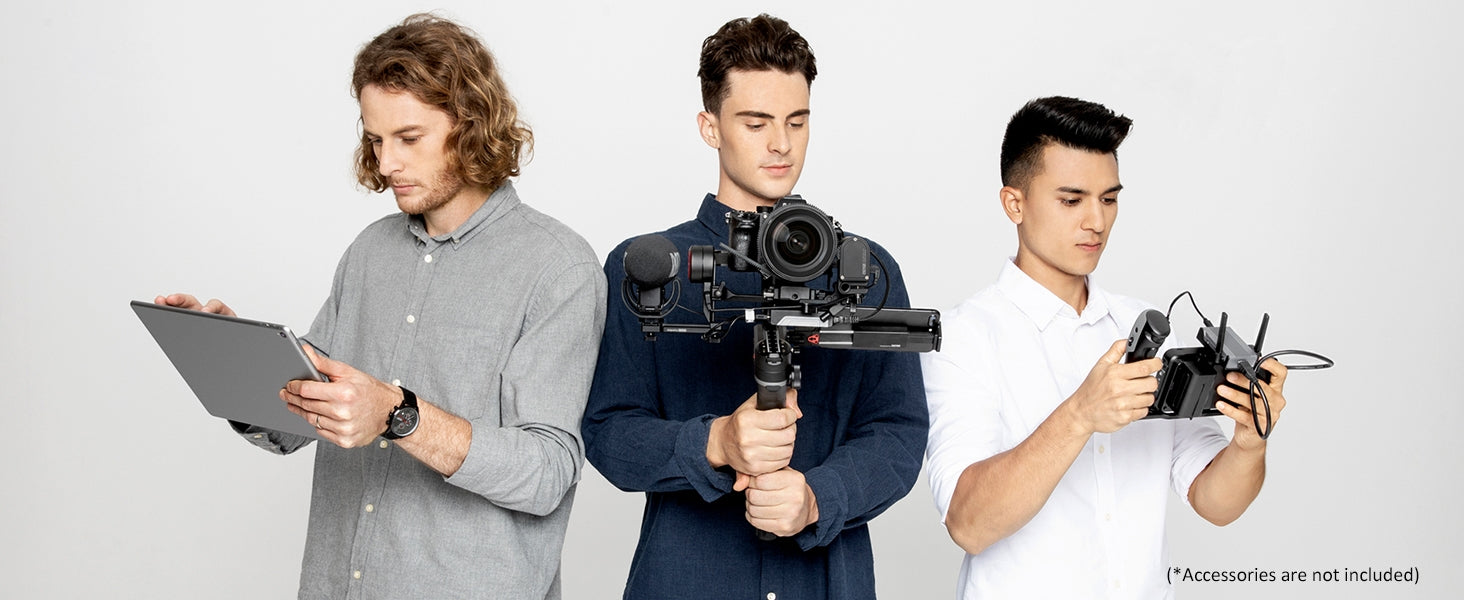 - Une fois l'émetteur et le récepteur de transmission d'image montés (accessoires), jusqu'à 3 appareils (smartphones, iPads, moniteurs) peuvent être connectés à votre stabilisateur.